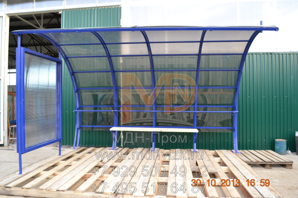 Доп. комплектация: знак автобусной остановки, ограждение для павильона, рекламный лайт бокс, табличка для объявлений.